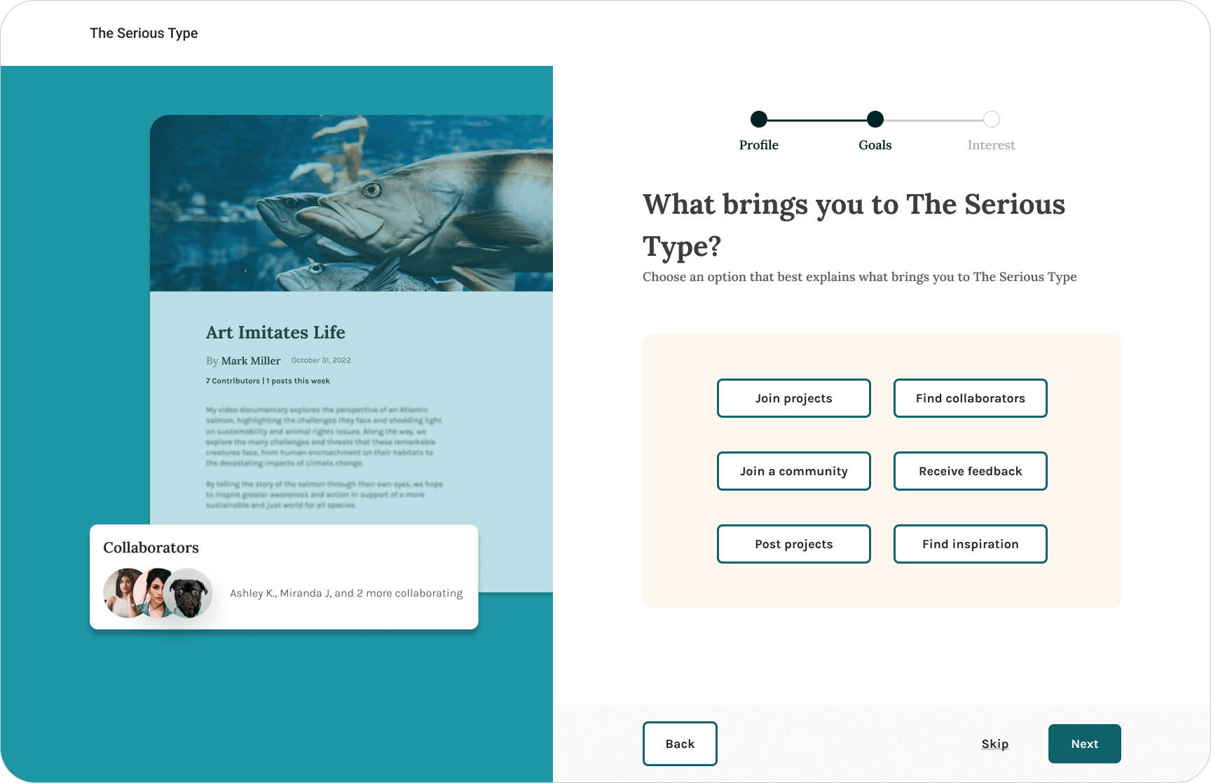 An online platform where creatives can join a shared mission — while contributing, learning, teaching, and inspiring one another in collaborative creative work.