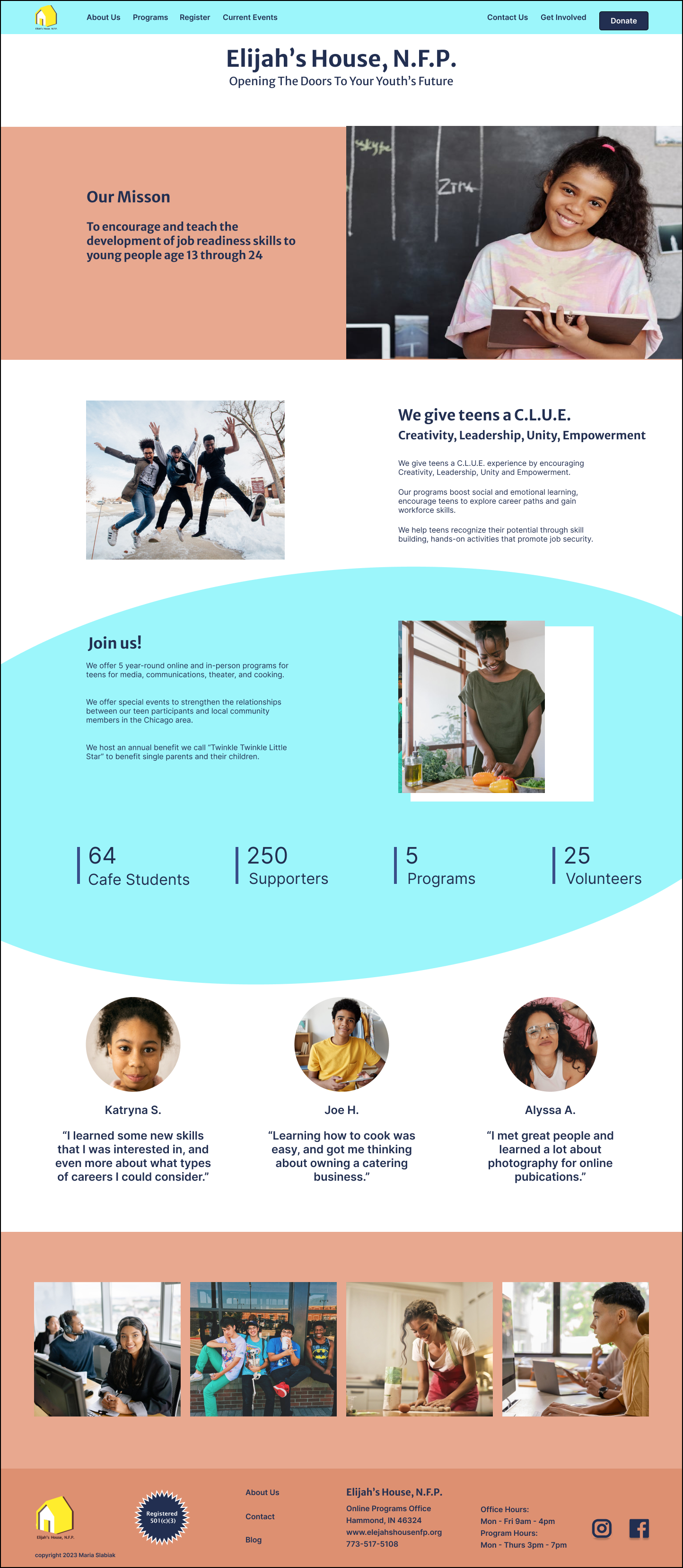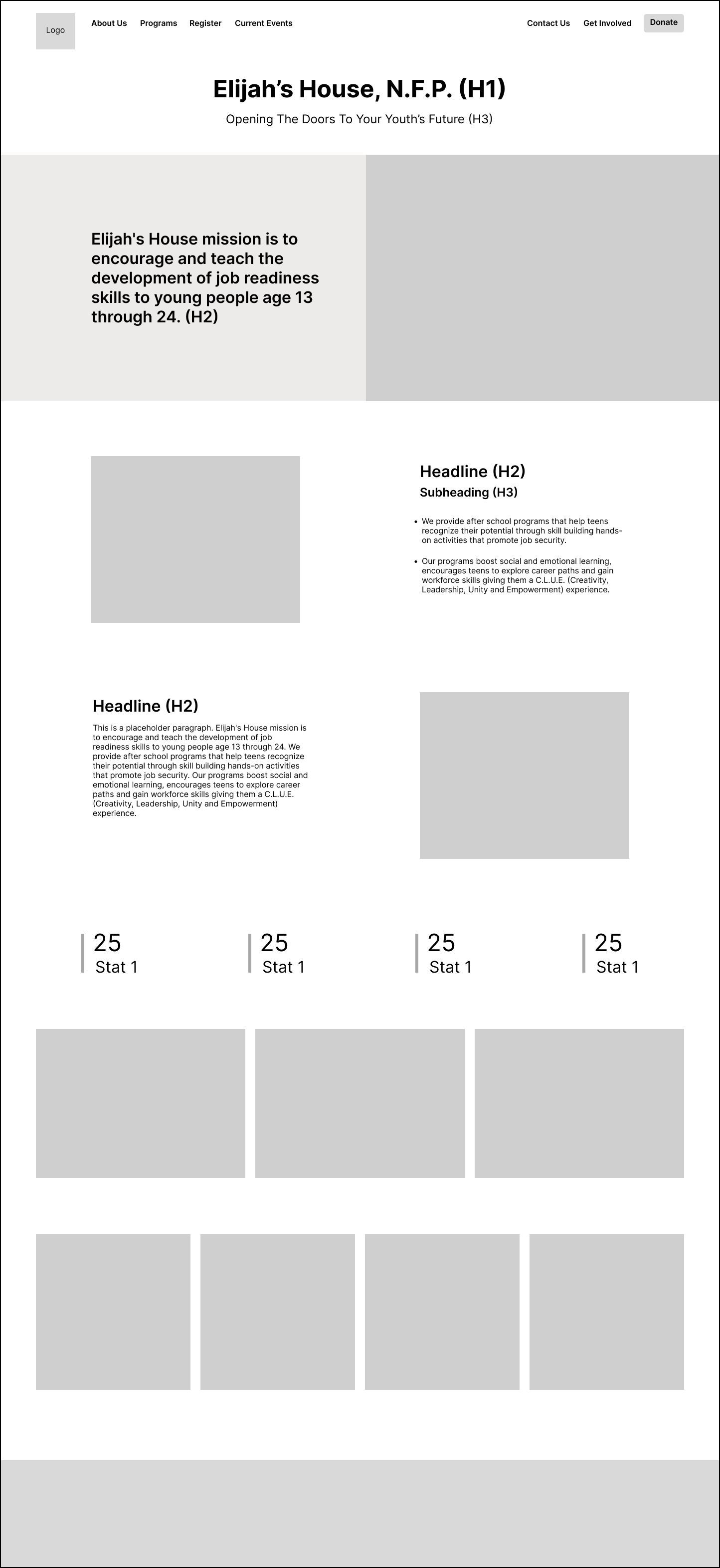 Home Page priorities: mission statement, link to programs, apply for a program, donate CTA